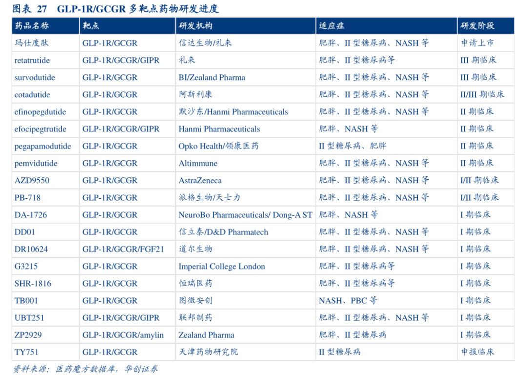 另外,已进入临床研究阶段的还有:博瑞医药GLP-1/GIP双重激动剂BGM0504、翰森制药GLP-1R/GIPR双靶点激动剂HS20094、众生药业RAY1225、华东医药GLP-1R/GIPR双靶点长效多肽类激动剂HDM1005等。